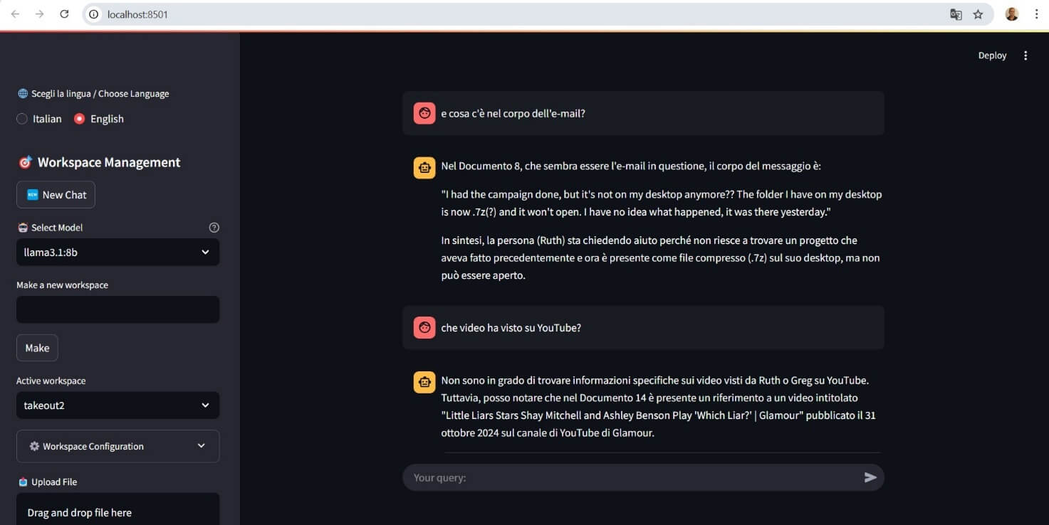 Forse per mia imperizia, non ho mai trovato un framework che rispondesse a queste necessità, quindi ho pensato, che con l’aiuto delle AI ed un po’ di mia abilità, potevo costruirmelo; la caratteristica più importante è che doveva girare tutto in locale, senza chiamate API a servizi online e soprattutto senza dover inviare documenti su RAG online.