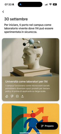 Una cosa che colpisce è che non sembra esserci un modo per navigare i pulse dei giorni precedenti. Questa che credo sia solo una limitazione temporanea, conferisce una sensazione di vedere elementi effimeri senza il bisogno di organizzare altre informazioni. Se si sceglie di salvare una particolare storia il sistema si limita a creare una chat con il contenuto della notizia in modo che si possa interagire ulteriormente col modello. Ho trovato molto interessante questa idea di trasformare l’articolo in una chat per approfondire, si tratta di un esempio di coniugazione di informazione e approfondimento personalizzato che potrebbe essere applicato anche in altri contesti, magari partendo da pezzi scritti e non generati.