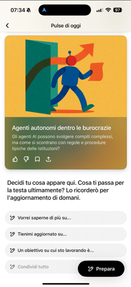 La novità principale non sta quindi tanto nel format, molto gradevole da navigare e senza troppe informazioni da farti sentire sovrastato, ma nel fatto che i modelli AI generano il tuo Pulse personale sfruttando la conoscenza che il sistema ha di te grazie alle chat con cui hai interagito nel tempo.