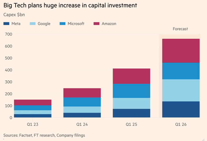Complessivamente, come ha sottolineato FT in un suo articolo del 6 febbraio successivo a tutte le presentazioni: “Big Tech’s breathtaking $660bn spending spree reignites AI bubble fear – Stocks tumble despite strong earnings from most Silicon Valley heavyweights”.