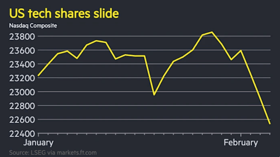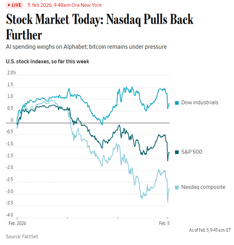 E nel frattempo il timore di una “AI disruption” che colpisca le imprese che operano nel software e in altri comparti digitali contribuisce, sommandosi alla paura di una “AI bubble” dovuta all’eccesso di investimenti, alla pesante caduta del Nasdaq.