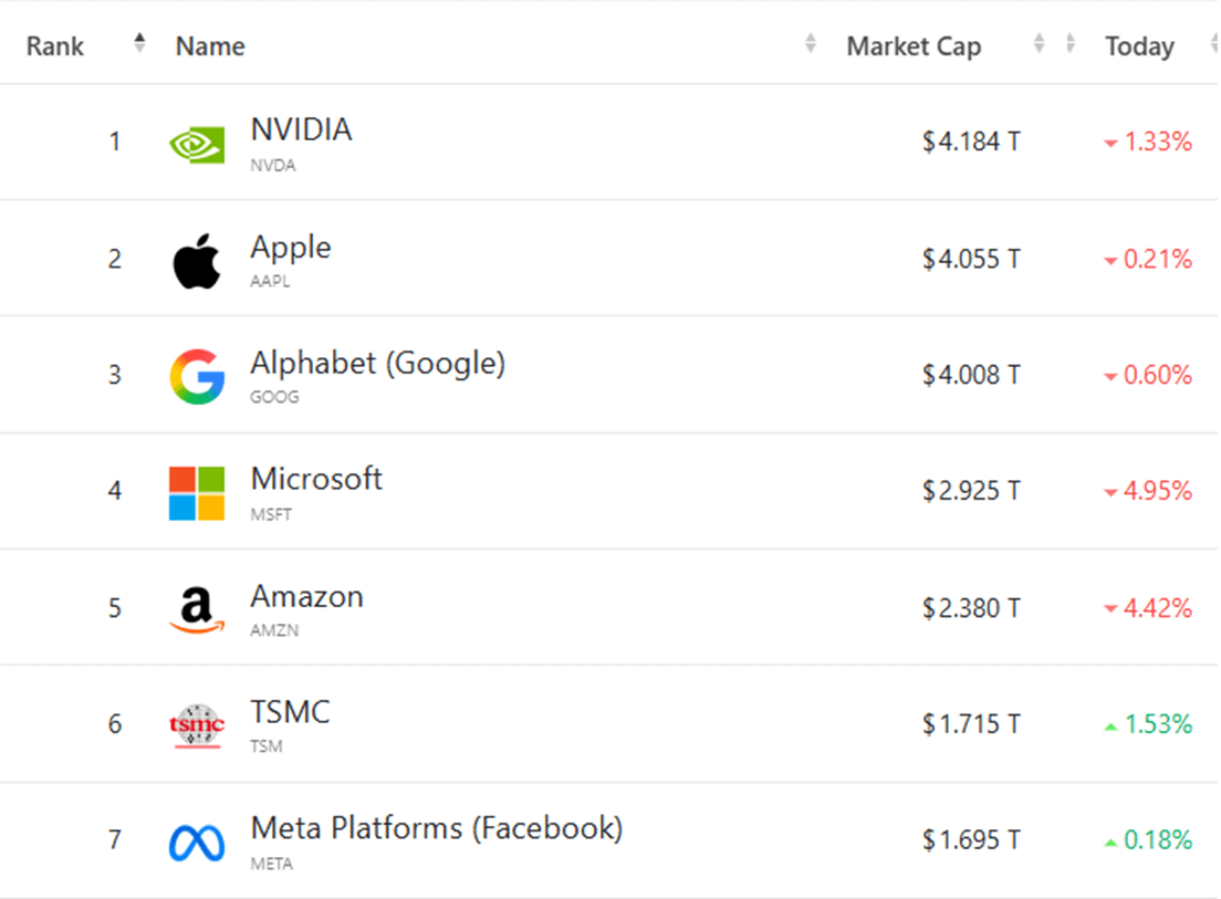 Una occasione importante per valutare come si stia muovendo il comparto tech, perché – anche se hanno dovuto cedere a Nvidia il primo posto nella classifica mondiale per capitalizzazione (market cap) – le cinque, pur con qualche temporaneo cedimento, continuano ad occupare le cinque posizioni successive.
