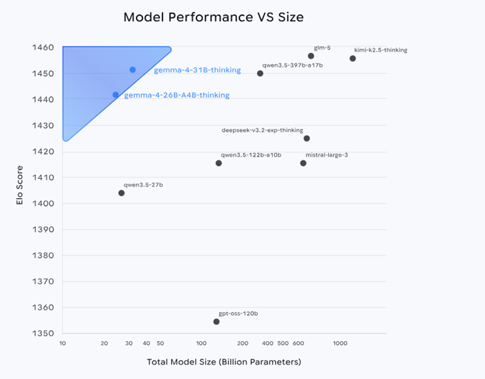 Figura 2. Nel grafico “Model Performance vs Size” pubblicato da Google, Gemma 4 31B e Gemma 4 26B A4B compaiono come modelli aperti capaci di restare molto in alto nel ranking Arena AI pur con una taglia nettamente inferiore rispetto a diversi concorrenti. Fonte: Google Blog.