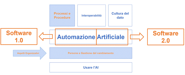- Aspetti organizzativi: ruoli chiari, competenze, flussi decisionali. Senza una chiarezza nella situazione organizzativa è difficile “fare AI” semplicemente grazie a soluzioni tecnologiche.