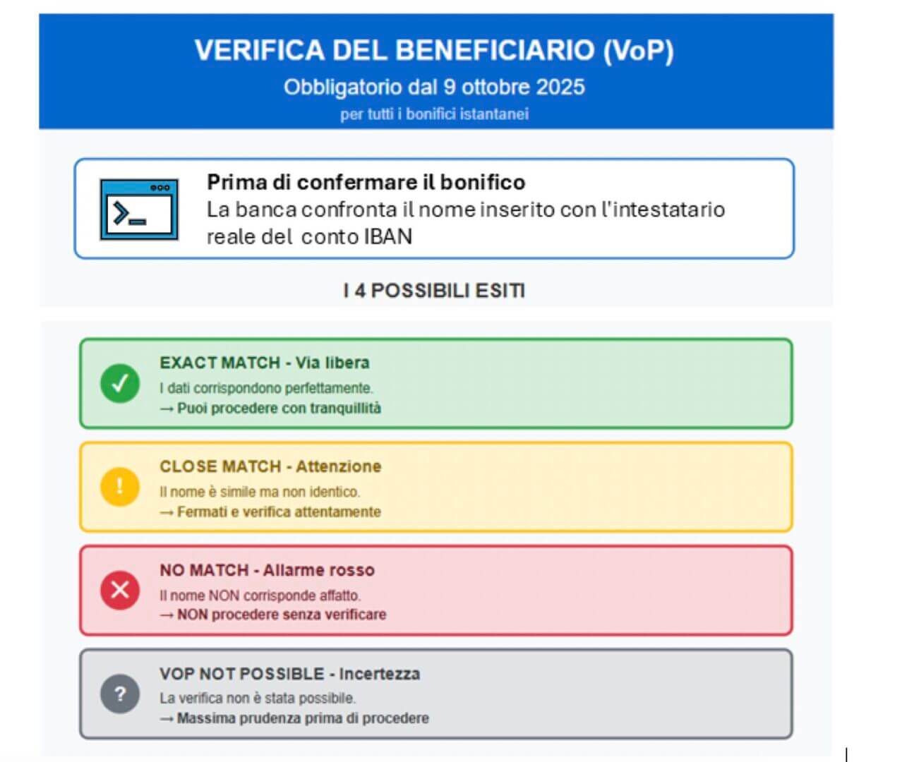 - “Exact Match” = via libera; “Close Match” o “No Match” = fermati e verifica; “VoP not possible” = massima prudenza