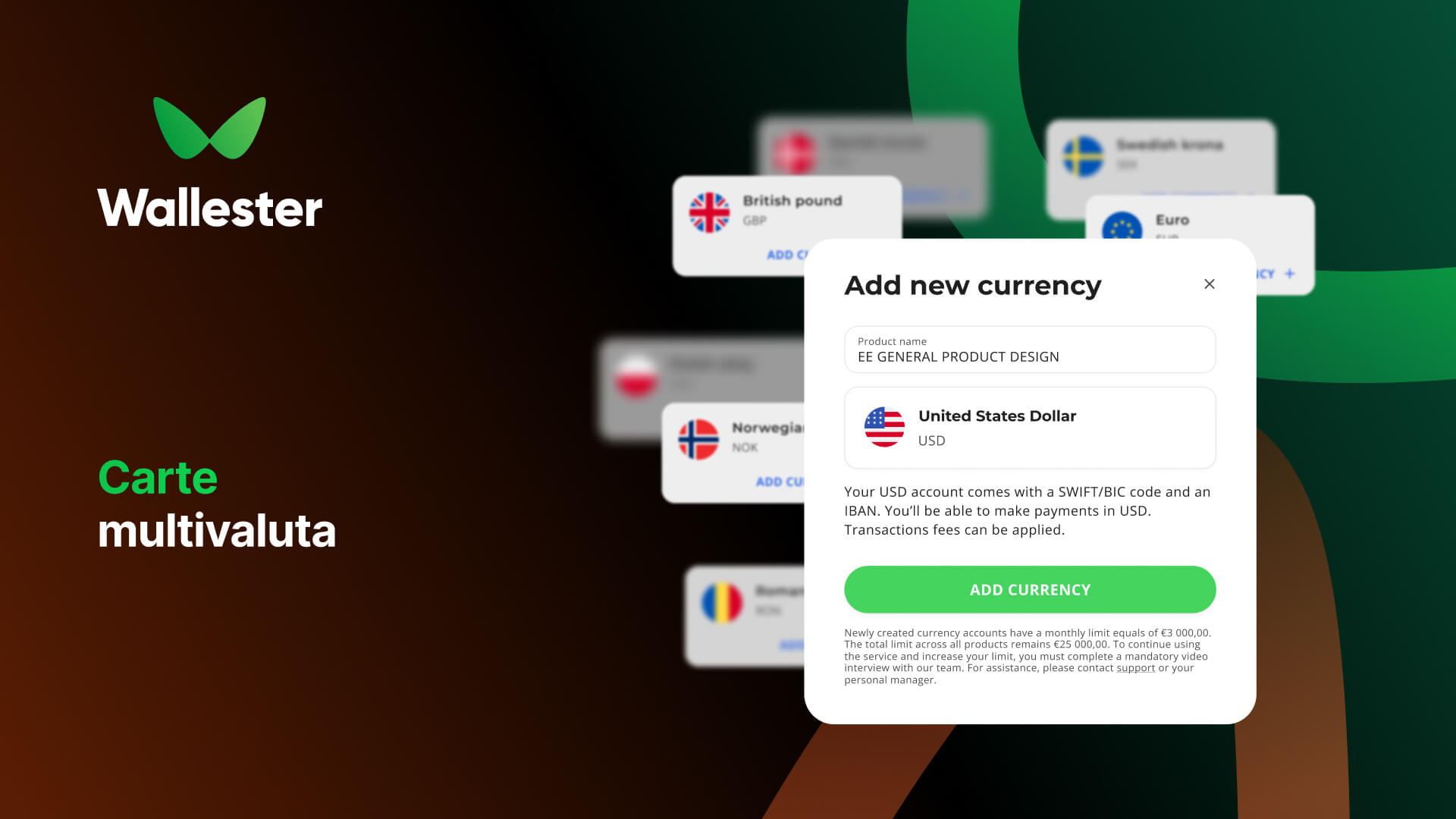 - Tasso di cambio: tasso ufficiale del circuito Visa maggiorato del 2,00%. Nota: i trasferimenti interni tra conti Wallester in valute diverse sono invece privi di commissioni di cambio aggiuntive (24/7 Currency Exchange).