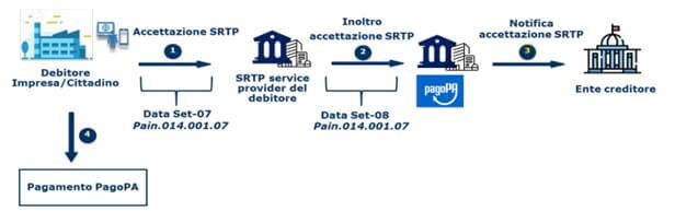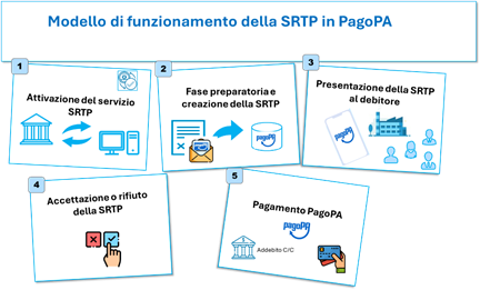 L’adozione della SRTP nel contesto di PagoPA offrirà la possibilità alle PA o ai Gestori di servizi pubblici (beneficiario del pagamento) di inviare, attraverso il proprio fornitore del servizio SRTP, una richiesta di pagamento a un cittadino o a un’impresa (debitore). Quest’ultimo riceverà la notifica, a sua volta tramite il proprio fornitore del servizio SRTP sui canali telematici abilitati (es. internet banking, mobile banking) e potrà decidere se pagare l’avviso subito o entro i termini indicati nella SRTP ricevuta. La soluzione replica quindi i modelli “Accept later/Pay now” e “Accept later/Pay later” dello schema SRTP, al fine di dare coerenza alle prassi previste nel contesto PagoPA.