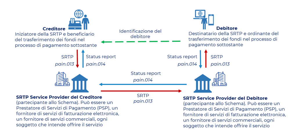 Creditore e debitore, utenti del servizio di SRTP, possono colloquiare tra loro avvalendosi di “fornitori di servizi SRTP” che consentono lo scambio delle informazioni relative a una richiesta di pagamento e all’accettazione/rifiuto della stessa (cfr. figura 1 che mostra la relazione tra i soggetti coinvolti nello scambio di una richiesta di pagamento secondo un classico modello a 4 parti).