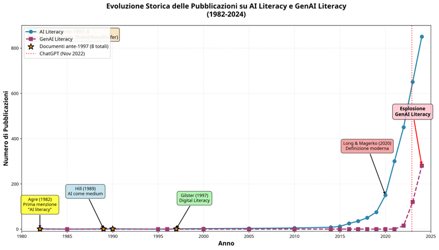 Figura 1: Andamento storico delle pubblicazioni su AI Literacy (1982-2024) e GenAI Literacy (2022-2024). Si noti la presenza di 8 pubblicazioni ante-2016, di cui 3 dal gruppo di Gerald Steinbauer-Wagner