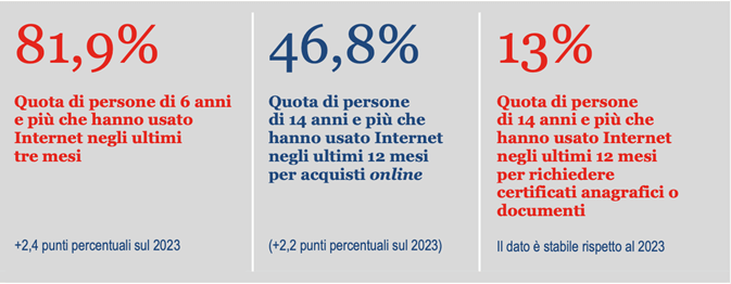 L’uso generico di internet da parte degli italiani pare molto esteso: l’ISTAT, il 28 aprile 2025, certifica nell’82% circa la quota di persone dai 6 anni in su che usano la rete. Questo valore sale al 93,4% tra le famiglie con almeno un componente tra i 16 e i 74 anni, in linea con la media UE27 (94,1%).
