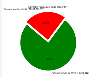 Altri Paesi quali Francia e Spagna erano attorno al 90%, il Regno Unito al 71%. Il recentissimo “Rapporto sulla connettività in fibra FTTH” dell’AGCOM dell’ottobre 2025 corregge la precedente percentuale di copertura nazionale nella nuova percentuale del 75,89% delle famiglie raggiunte dalla rete.