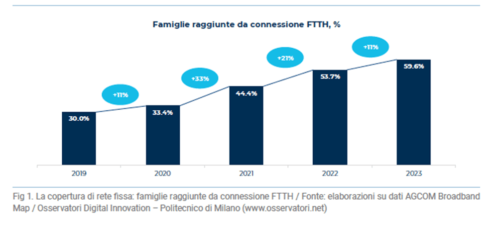 Dopo circa dieci anni dalla pianificazione promossa dal Governo Renzi con la Strategia di crescita digitale 2014-2020, e a seguito degli investimenti promossi in seno ai programmi del PNRR, il rapporto “FTTH/B (Fiber To The Home/Building) Market Panorama in Europe 2024” attestava una copertura FTTH/B per il 64% delle famiglie a settembre 2024, sotto la media dei 39 Paesi europei monitorati al 75%.