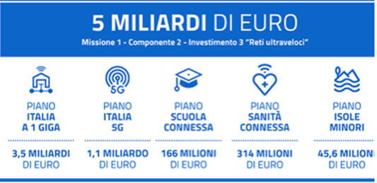 Sono stati previsti nel 2021 circa 5 miliardi di investimento, così suddivisi, per affrontare questi punti di crisi e trasformarli in leve di coesione digitale.