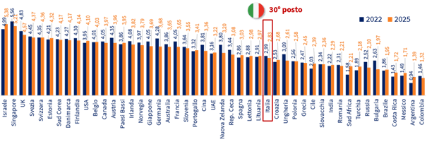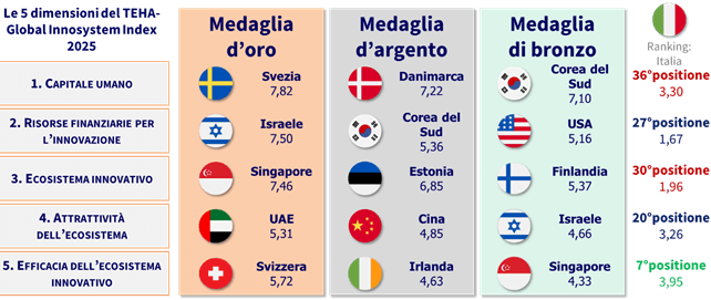 Analizzando le diverse macrodimensioni del TEHA-GII 2025, emergono differenze significative per l’Italia. L’area in cui il Paese performa peggio è il capitale umano, dove si posiziona al 36° posto su 47 con 3,30 punti, ben distante dai paesi sul podio: Svezia, Danimarca e Corea del Sud con 7,82, 7,22 e 7,10 punti rispettivamente. Anche per quanto riguarda la presenza di ecosistemi innovativi, categoria dove i primi paesi a occupare il podio sono Singapore, Estonia e Finlandia, l’Italia occupa una posizione più arretrata, al 30° posto. Tuttavia, si registra una performance più promettente per l’efficacia complessiva dell’ecosistema innovativo, dove l’Italia si colloca al 7° posto. Questa differenza nei risultati sottolinea la complessità del panorama dell’innovazione italiana e suggerisce aree di miglioramento per potenziare ulteriormente il suo ruolo nell’ecosistema globale dell’innovazione.