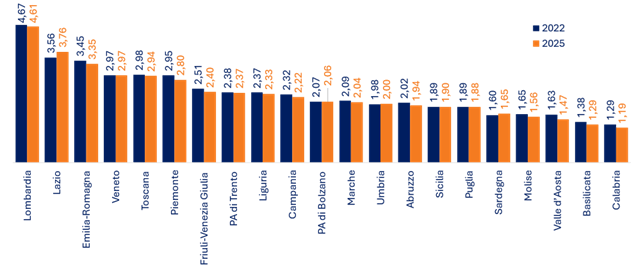 Figura 4 – Classifica delle Regioni Italiane secondo il TEHA-RII 2022 e 2025. Fonte: elaborazioneTEHA Group, 2025.