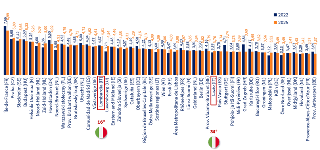 Nella classifica delle prime cinquanta regioni, due regioni italiane si sono assicurate una posizione: la Lombardia, che si colloca al 13° posto con un punteggio di 4,61, e il Lazio al 34° posto con un punteggio di 3,76.