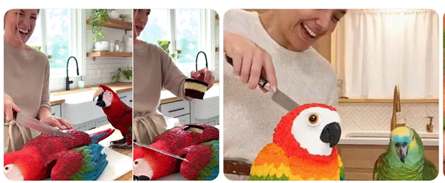 Sui social più popolari circolano quotidianamente video generati artificialmente che non riportano alcuna etichetta visibile: emblematico il caso divenuto virale su TikTok del pappagallo che “assiste” al taglio di una torta identica al suo corpo, contenuto che secondo People sarebbe con ogni probabilità frutto di un generatore video. Il contenuto non mostra alcuna indicazione di provenienza algoritmica, a fronte di decine di milioni di visualizzazioni, lasciando il pubblico libero di credere alla sua autenticità (People, 2025).