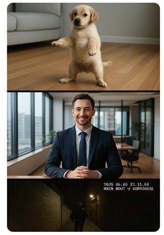 Le tre immagini che seguono[3] — il cucciolo, l’uomo impeccabile in un ufficio di vetro e la scena sfocata ripresa da una telecamera notturna — sono una dimostrazione concreta della facilità con cui oggi è possibile immettere in rete contenuti sintetici non etichettati. Non riportano watermark, né metadati C2PA, né alcun segno che consenta all’utente di riconoscerne l’origine artificiale. Se venissero pubblicate su TikTok, Instagram o Facebook, scorrerebbero nella timeline esattamente come le milioni di immagini reali che ogni giorno nutrono il nostro sguardo, e nulla — né per gli utenti né per molti sistemi automatizzati di moderazione — farebbe scattare un dubbio.