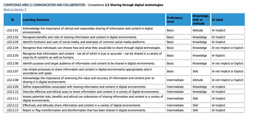 Per esempio, valutare l’affidabilità di contenuti online, che potrebbero essere prodotti da AI oppure utilizzare strumenti digitali, che integrano algoritmi predittivi o di raccomandazione oppure proteggersi da rischi come deepfake, filtri manipolativi o ancora disinformazione automatizzata. AI-Non Implicit or Explicit: solo in questo caso la competenza non coinvolge l’AI. Per esempio, interagire tramite tecnologie di comunicazione digitale di base oppure competenze tecniche che possono esistere indipendentemente dall’AI.