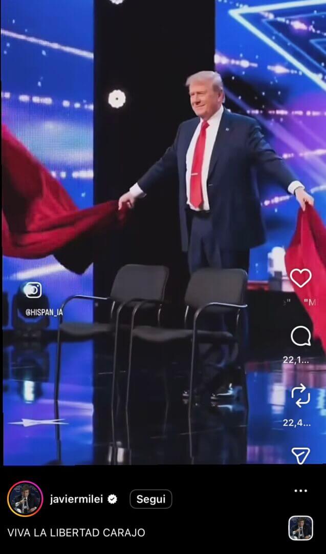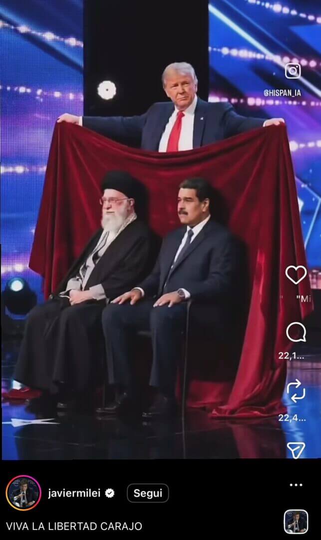 Giorgia Meloni seduta in prima fila con Javier Milei e Benjamin Netanyahu tra il pubblico in uno studio televisivo, ad assistere a uno spettacolo di magia di Donald Trump. Il presidente USA fa sparire sotto a un telo l’ayatollah Alì Khamenei, ucciso nel contesto della guerra mossa da Stati Uniti e Israele all’Iran, e Nicolás Maduro, presidente del Venezuela catturato a gennaio in un’operazione condotta dagli Usa. I celebri spettatori sorridono, si divertono. Tutto finto. Si tratta di un video deepfake, prodotto con AI, ma a colpire è un particolare: è stato diffuso da quello che sembra proprio essere l’account ufficiale Instagram del presidente dell’Argentina, Milei appunto. Il profilo ha il verification badge blu di Meta e più volte su diversi media è stato indicato come account ufficiale Instagram del presidente argentino.