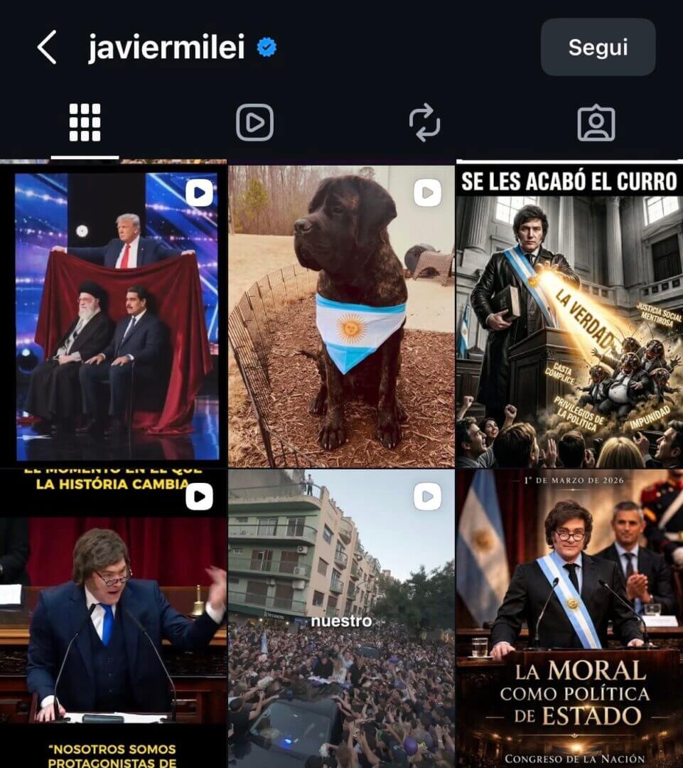 Il profilo Instagram ufficiale di un presidente è una fonte ufficiale. Che sia il politico stesso o uno staff a occuparsene, si tratta di un canale di comunicazione che si ritiene autorevole. Milei ha scelto da sempre uno stile di comunicazione istituzionale eccentrico, considerando gli standard della comunicazione politica, pubblica e governativa, puntando molto sull’uso dell’AI, creando immagini forti, d’impatto, sintetizzando i messaggi con parole precise e spesso dal tono “urlato”. Uno storytelling che si può definire sopra le righe e che punta alla pancia degli utenti.