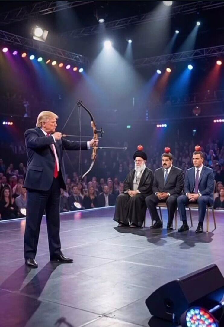 Il video prosegue mostrando il palco, su cui si trova Donald Trump che sta facendo un gioco di prestigio. Prima pone un telo su Alì Khamenei e Maduro, seduti davanti a lui. Poi, Trump toglie il telo e i due leader non ci sono più.