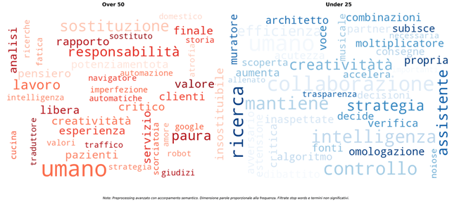 La presente ricerca conferma e approfondisce le tendenze identificate in letteratura riguardo al divario generazionale nell’atteggiamento verso l’Intelligenza Artificiale, evidenziando una marcata differenza tra over 50 e under 25 che si sostanzia, in linea con la letteratura, con atteggiamenti profondamenti diversi (Chan & Lee, 2023; Alabbad et al., 2025) che generano pattern linguistici e costellazioni terminologiche profondamente diverse.