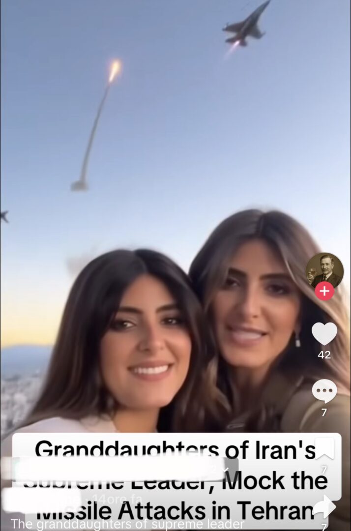 Il 2 marzo invece un utente ha pubblicato un video chiaramente realizzato con AI in cui due ragazze esultano sotto le bombe. L’utente le ha indicate in didascalia come “le nipoti del supremo leader Alì Khamenei”. Questo deepfake prende le mosse da una notizia popolare: nel 2022 l’ingegnera e attivista Farideh Moradkhani, oggi cinquantacinque anni, che davvero è nipote di Khamenei, era stata condannata a tre anni di reclusione.