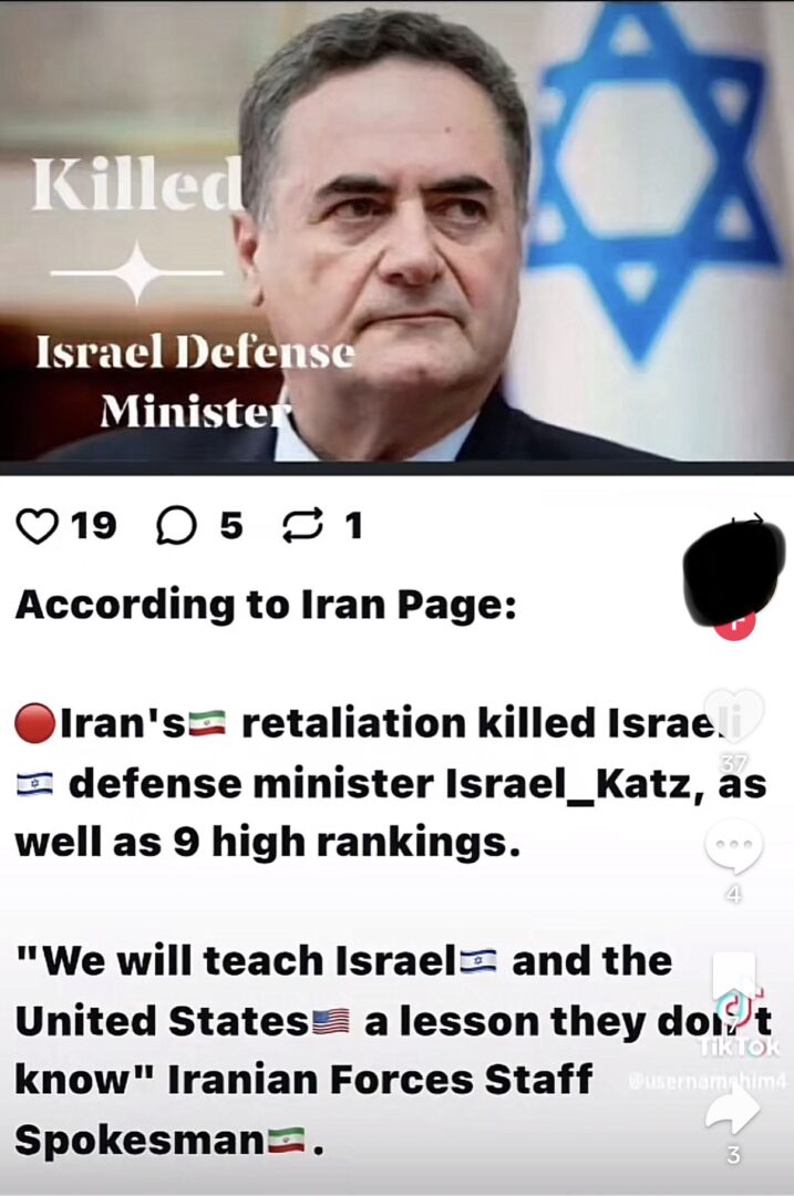 Una fake news che ha avuto particolare risonanza tra gli utenti di TikTok è quella relativa all’uccisione del ministro della Difesa Israel Katz da parte dell’Iran, ripostata in diversi post da vari utenti e canali, alcuni con nomi che suggeriscono fintamente una qualche ufficialità.