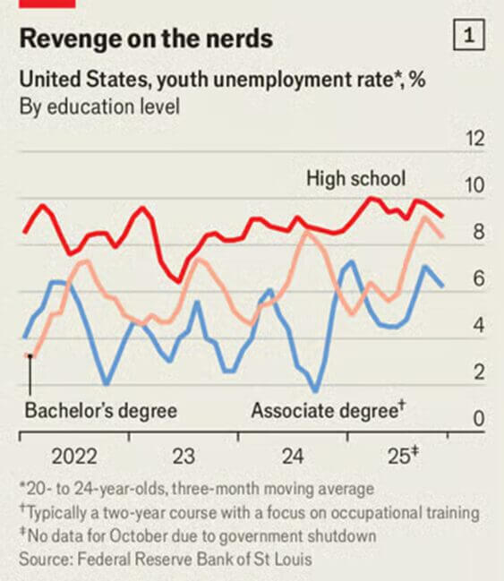 Partiamo da un dato spesso citato in modo selettivo. Secondo le elaborazioni pubblicate da The Economist su dati della Federal Reserve, tra i giovani statunitensi di età compresa tra i 20 e i 24 anni la laurea continua a offrire una protezione significativa contro la disoccupazione. I tassi restano sistematicamente più bassi per chi possiede un bachelor’s degree rispetto a chi ha solo un diploma di scuola superiore, mentre i titoli biennali professionalizzanti mostrano una dinamica intermedia e più volatile.