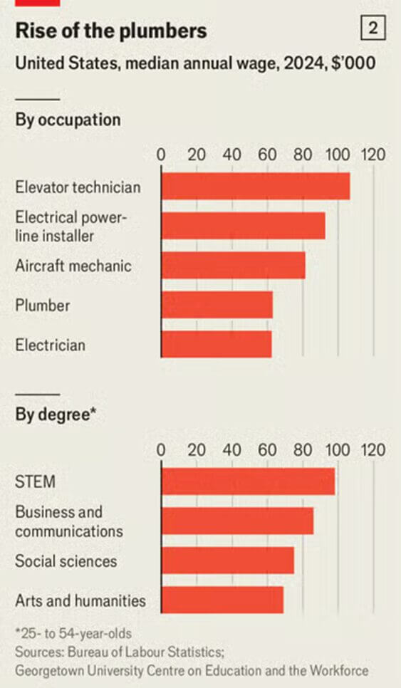 Tecnici degli ascensori, installatori di linee elettriche, meccanici aeronautici superano stabilmente i 90 o 100 mila dollari annui. Idraulici ed elettricisti si collocano su livelli comparabili, in alcuni casi superiori a quelli di molte lauree non STEM.