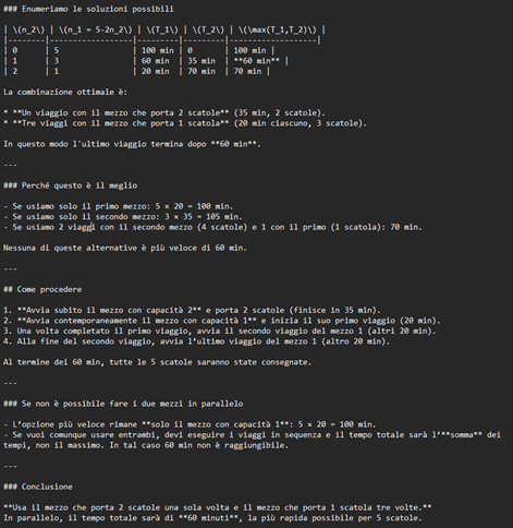 “Senti ho pescato 5 casse di pesci, ho due mezzi uno che porta 1 scatola e l’altro 2 ma il primo ci mette 20 min per portarlo il secondo 35. Come mi conviene organizzare i viaggi?”