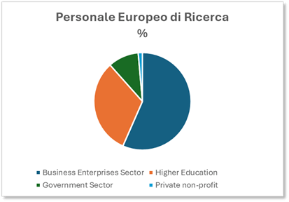 Secondo i dati Eurostat 2023[9] i ricercatori in Europa impiegati a tempo pieno (Full Time Equivalent, FTE) sono 2,15 milioni così distribuiti: oltre la metà (56,6%) impiegati all’interno di imprese private (business enterprises), il 31,8% opera nel settore dell’istruzione superiore (higher education) e il 10,2% nel settore governativo, ovvero circa 220.000.