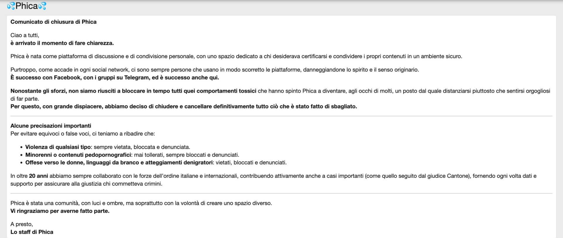 Come si leggeva nel comunicato di addio dello staff, “Phica è nata come piattaforma di discussione e di condivisione personale, con uno spazio dedicato a chi desiderava certificarsi e condividere i propri contenuti in un ambiente sicuro. Purtroppo, come accade in ogni social network, ci sono sempre persone che usano in modo scorretto le piattaforme, danneggiandone lo spirito e il senso originario. È successo con Facebook, con i gruppi su Telegram, ed è successo anche qui“.
