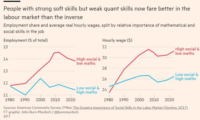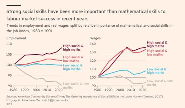 I dati mostrano infatti un’inversione storica rispetto agli anni Ottanta. Oggi i profili che combinano capacità di interazione, lettura del contesto, persuasione e coordinamento ottengono risultati migliori nel mercato del lavoro anche quando le competenze matematiche o formali sono relativamente più deboli. Non si tratta di una svalutazione delle competenze tecniche, ma di un cambiamento nel modo in cui esse generano valore. Sempre meno come abilità isolate, sempre più come strumenti inseriti in processi complessi e collettivi.