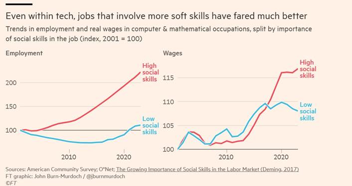 Una possibile obiezione a questa lettura è che valga in generale, ma non nei lavori tecnologici e quantitativi, storicamente associati a forti premi salariali. Anche qui, però, i dati raccontano una storia diversa. All’interno delle stesse professioni tech, crescono di più i ruoli che combinano competenze tecniche con collaborazione, creatività e interazione rispetto a quelli più isolati e puramente esecutivi.