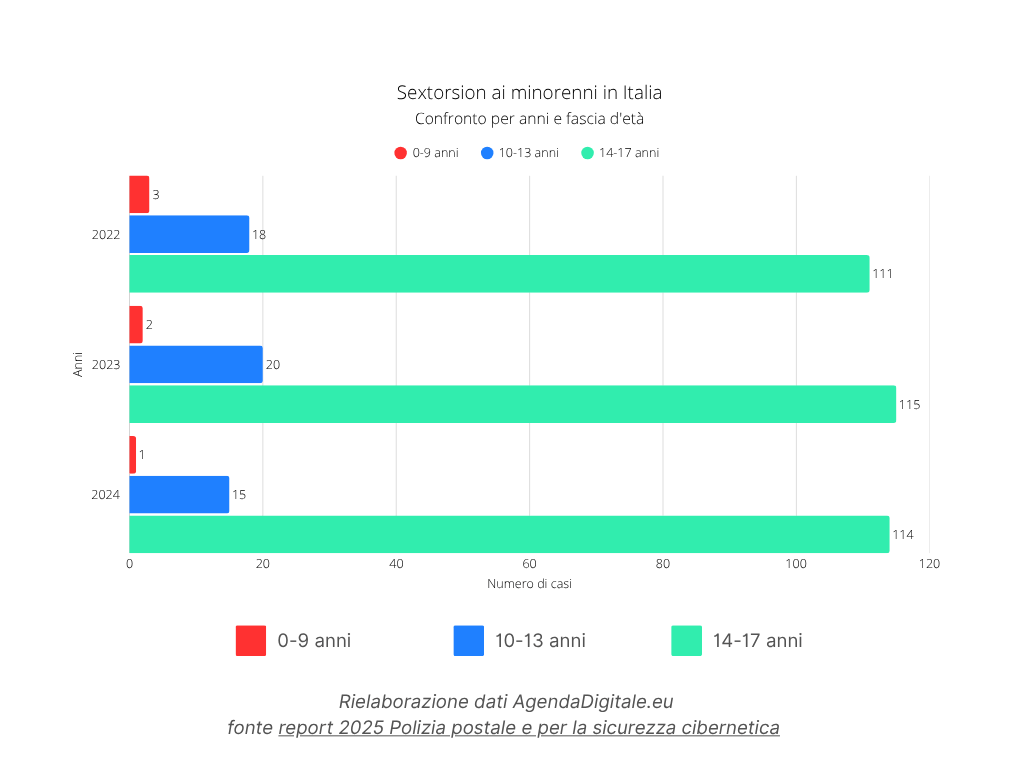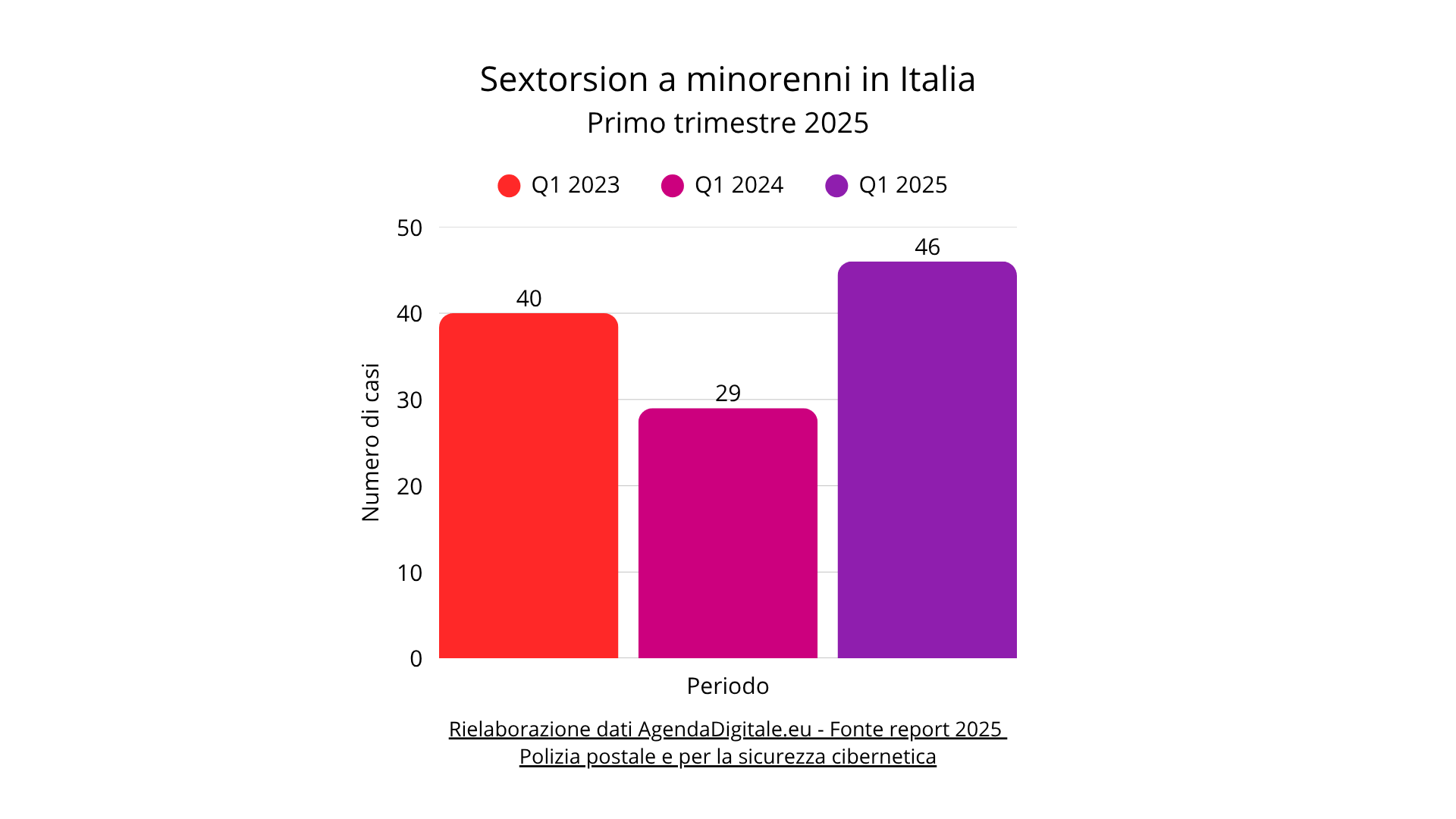 In Italia, i dati annuali della Polizia postale e per la sicurezza cibernetica pubblicati nel 2025 relativi ai reati su minori, indicano che nel 2024 le segnalazioni di sextorsion sono all’incirca stabili, con 130 casi nel 2024 rispetto ai 137 del 2023 e i 132 del 2022. Sono leggermente aumentati i casi relativi alla fascia d’età delle vittime dai 14 ai 17 anni. Nel primo trimestre 2025, invece, si è già registrato un aumento rispetto allo stesso periodo dell’anno precedente.