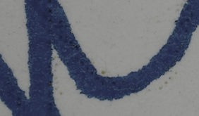 Interruzione della linea – Nell’originale e prima fotocopia è visibile alleggerimento del tracciato nel gesto ascendente. Tale aspetto non risulta più visibile a partire dal terzo passaggio di copia, dove l’alleggerimento diventa una vera e propria interruzione del tracciato.