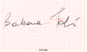 Nell’esempio sottostante, le firme mostrano compatibilità evidenti nella forma, ma diversi parametri dinamici: l’esame dinamico evidenzia anomalia nella tempistica di redazione, riconducibile ad una sosta anomala tra nome e cognome.