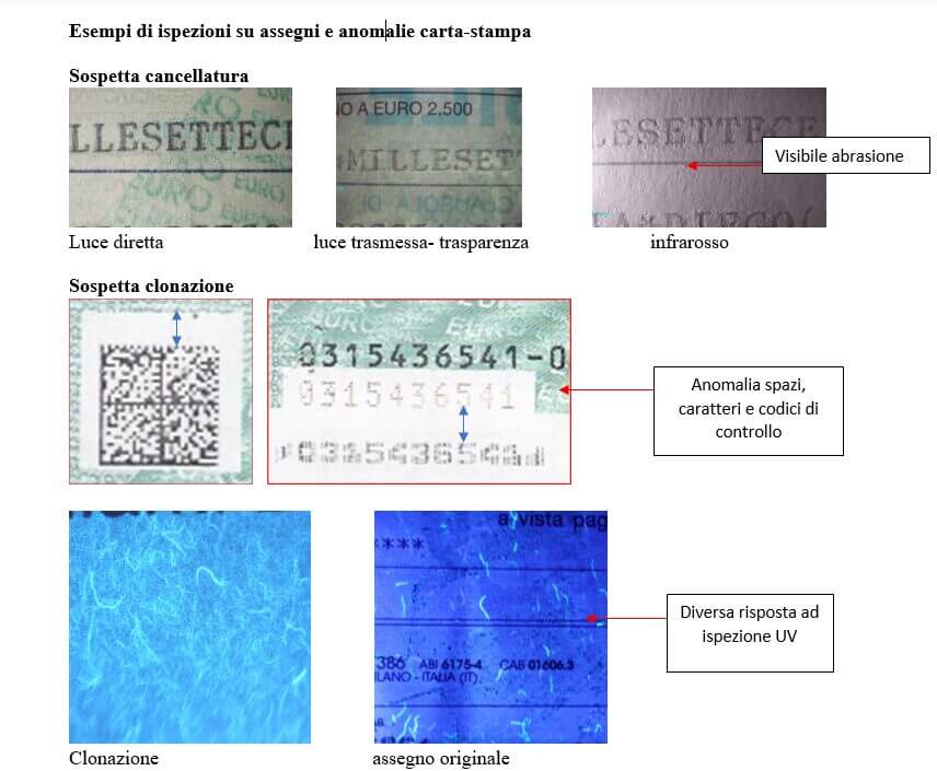Esempi di ispezioni su assegni e anomalie carta-stampa: