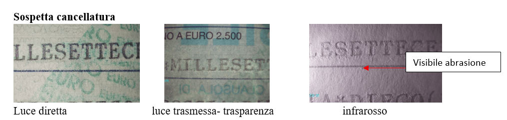 Talvolta l’indagine ad infrarosso è essenziale per accertare la presenza di anomalie o tracce sottostanti non visibili a occhio nudo. Anche in caso di ispezione su documento in originale, va considerato che residui di stampa sottostante al tracciato manoscritto potrebbero essere dovuti a cancellature con tecniche sofisticate che non determinano abrasione del supporto.[9]