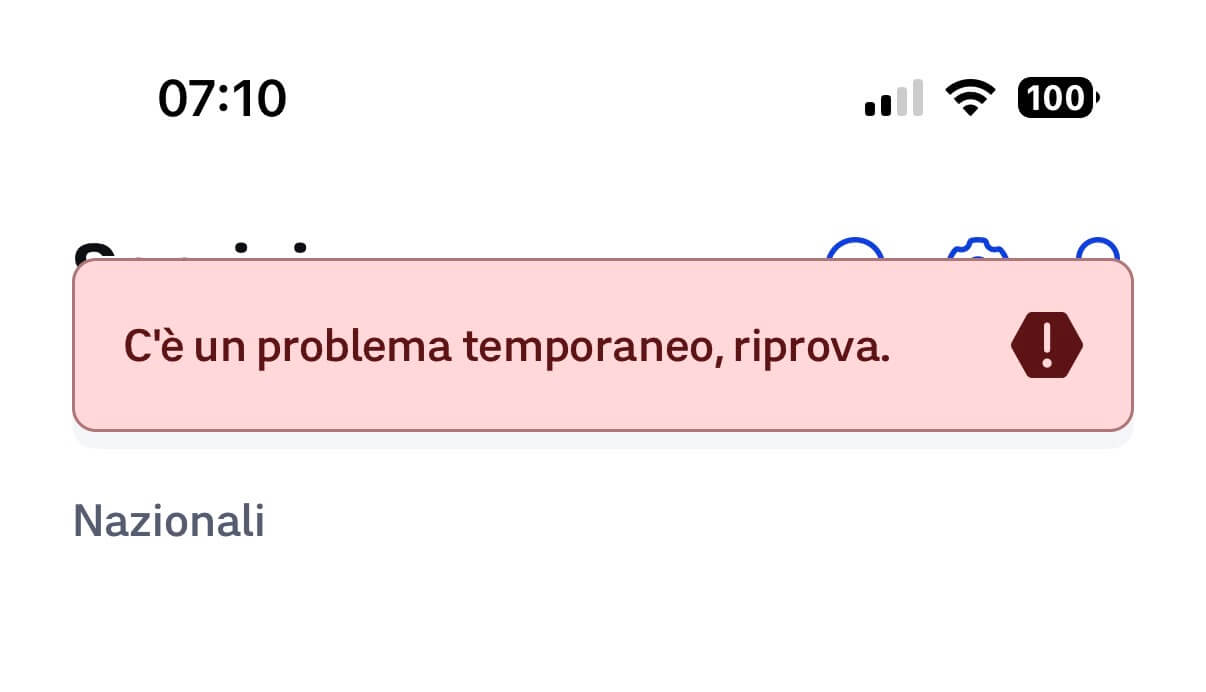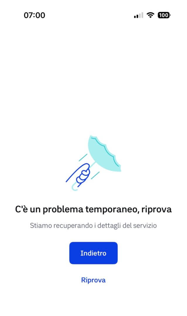 Alle 7 invece è comparso un messaggio di errore quando si cercava di accedere all’incentivo. Alle 7:10 l’app dava errore anche nella schermata iniziale, senza nemmeno cercare di accedere all’incentivo.