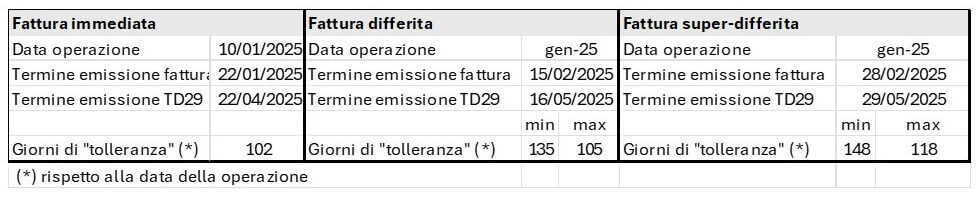 Il Cessionario/Committente che abbia acquistato beni o servizi senza che sia stata emessa fattura nei termini di legge o con emissione di fattura irregolare, deve comunicare l’omissione o l’irregolarità all’Agenzia delle entrate con tipo documento TD29 da inviare tramite SDI entro novanta giorni dal termine in cui doveva essere emessa la fattura o da quando è stata emessa la fattura irregolare. La data entro cui effettuare la comunicazione non segue quindi la data della operazione ma del termine entro cui si sarebbe dovuta emettere la fattura; il termine pertanto potrebbe variare secondo quando indicato nel prospetto che segue[5].