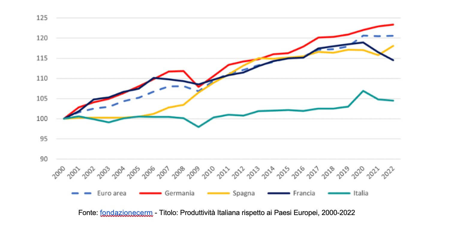 Fonte: fondazionecerm – Titolo: Produttività Italiana rispetto ai Paesi Europei, 2000-2022