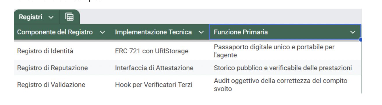 L’innovazione fondamentale risiede nel modo in cui l’identità è gestita. Non si tratta di un account statico, ma di un’entità definita da un “AgentCard” off-chain. Questo file di metadati, conforme a RFC 8615[7], contiene informazioni cruciali: le capacità dell’agente, gli endpoint di comunicazione (A2A, MCP[8], ENS[9]) e i protocolli di fiducia supportati. Grazie a questo sistema, gli agenti diventano entità indicizzabili e ricercabili tramite strumenti standard, permettendo, ad esempio, a un agente di gestione portafoglio DeFi di trovare autonomamente un agente specializzato in analisi di mercato senza intervento umano.