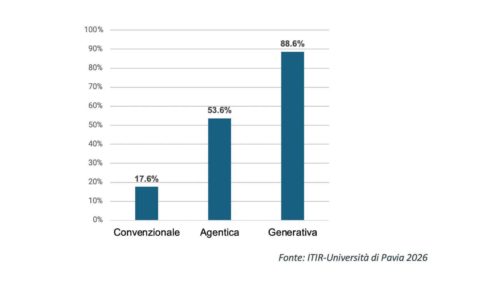 Il livello di adozione varia ancor più significativamente in base al tipo di AI: l’AI convenzionale si attesta al 17,6%, mentre l’AI generativa all’88,6% e l’AI agentica al 53,6%. Tale evidenza conferma come sia l’AI generativa sia quella agentica abbiano già superato l’AI convenzionale in quanto a livelli di adozione, nonostante quest’ultima sia presente da molti più anni.