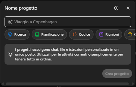 Il progetto non è solo una cartella di chat, definisce infatti un contesto informativo che include istruzioni, documenti, memoria e chat che saranno utilizzate per orientare una nuova conversazione. Quando si crea un nuovo progetto ci viene chiesto lo scopo de progetto e il suo nome: