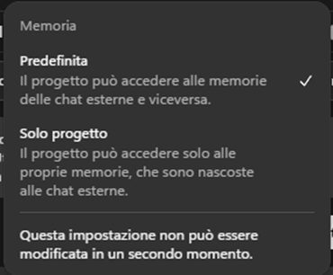 Selezionando l’icona delle impostazioni è possibile determinare il funzionamento della memoria di GPT. Per default le chat nel progetto potranno accedere alle memorie contenute in tutte le chat dell’utente, ma è possibile limitare la memoria alle informazioni contenute nel solo progetto.