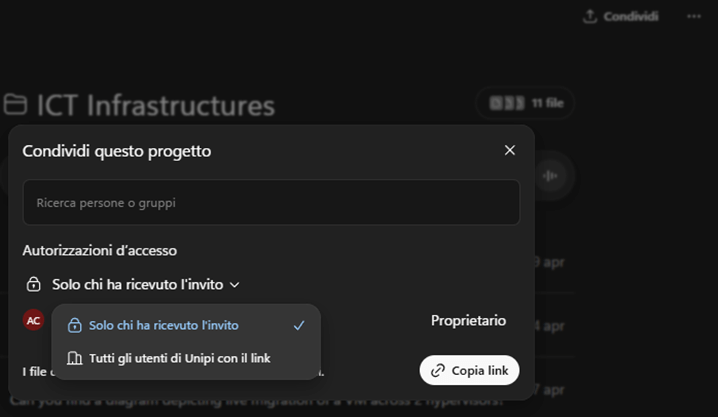 Se si dispone della funzione (che l’amministratore del tenant deve abilitare) in alto a destra della pagina del progetto appare l’opzione “Condividi” che apre la finestra di condivisione.