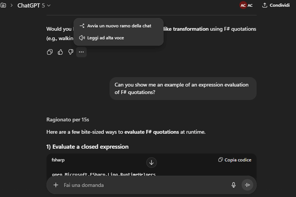 In effetti non molti si sono accorti dell’esistenza della funzione di creare nuovi rami di una conversazione. Se si selezionano i tre puntini al termine di qualsiasi risposta di una chat è possibile creare un nuovo ramo, ovvero si può creare una copia della chat fino a quel punto per poi proseguire con la conversazione. Questo può essere utile per sperimentare senza che troppi tentativi si accumulino nella singola chat rendendo le risposte meno focalizzate nel caso di ragionamenti ipotetici.